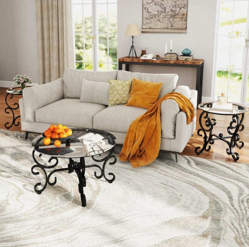 Product Name:3 Piece Tempered Glass Surface Coffee Table Set, Decor Coffee Table Round End Side Table with Sturdy Construction for Living Room (Rustic Black)